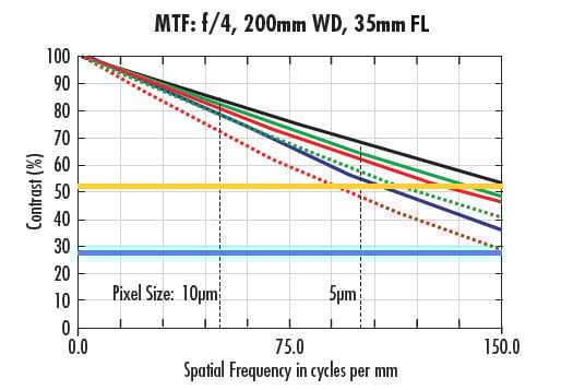 Figure 4 features the MTF for a 35mm lens design using white light at f/4 (a) and f/2 (b). The yellow line on both graphs shows the diffraction-limited contrast at the Nyquist limit for Figure 4a while the blue line denotes the lowest actual performance at the Nyquist limit of the same lens at f/4 in Figure 4a. While the theoretical limit of Figure 4b is far higher, the performance is much lower. This example shows that higher f/#s can reduce aberrational effects, greatly increasing lens performance, even if the theoretical performance limit is greatly reduced. The primary tradeoff of stopping down the lens (increasing the f/#), besides resolution, is less light throughput.
