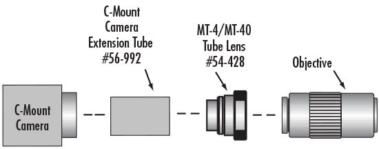 The seven-component setup can be a little tricky, but the following explanation aims to make the process as simple as possible. To start, #58-329 MT-1/ MT-2 C-mount Adapter can be opened up and the MT-1 or MT-2 Tube Lenses fit inside. Since the tube lenses themselves have no threads, this adapter provides the necessary C-threads on both sides. Between this adapter and the C-mount camera, an additional 190mm of extension tubes is required. Since the tube lens does not attach directly to the objective, use #55-743 Mitutoyo to C-Mount 10mm Adapter to attach the objective (this adapter adds 10mm of length and adapts the M26 thread to a C-thread). An additional 76.5mm of space between the tube lens and objective is optimal, but it is common to only use about 56.5mm of space between #55-743 and #58-329 since each adapter adds about 10mm of space. With this 56.5mm of space, use extension tubes or add other optical components such as beamsplitters, optical filters, polarizers, etc.