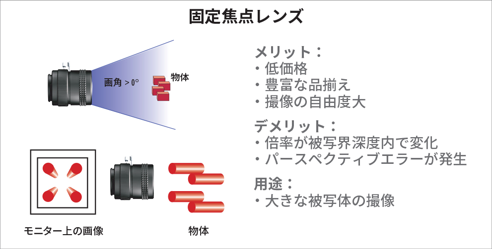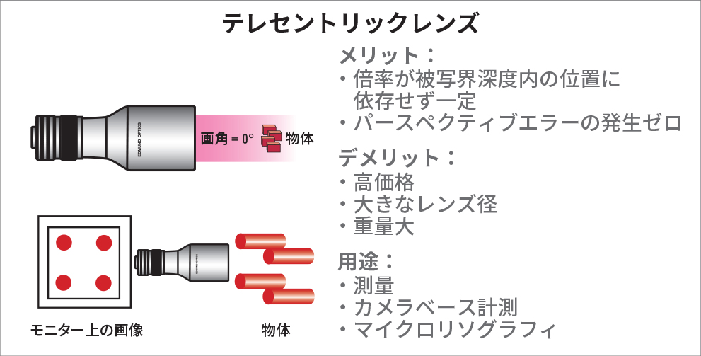 カメラレンズには撮像できる範囲を角度で表した『画角』というスペックがあります。レンズ設計者の視点から見ると、画角は主光線 (Chief Ray) が光軸となす角度を全角で 表わした値ということになります。従来の標準的カメラレンズ製品 (上図左) の場合、ある所定の画角を持っているため、異なる物空間距離にある (遠近の位置関係を持っ た) 被写体を撮像した場合に、レンズから近い距離に位置する被写体の方が、遠い距離に位置する被写体よりも大きく映るといった現象が起こります。またその位置的な 誤差 (パースペクティブエラー) も同時に起こります。この現象は人間の瞳で同様な被写体を見る場合も同じで、この現象により、被写体の奥行きを感じることが出来ます。テレセントリックについて詳しくはこちら
