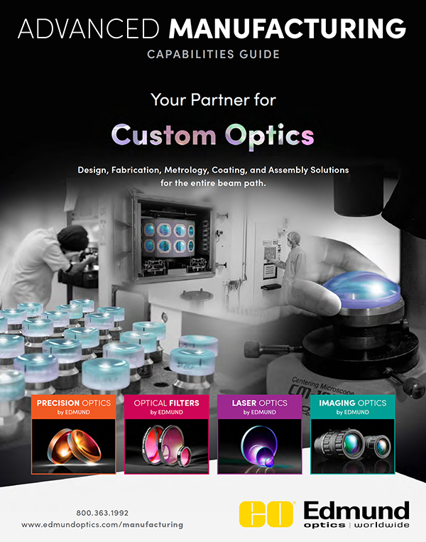 From prototype to volume production, off-the-shelf or custom, Edmund Optics can provide the optical components to meet your specific need. This useful guide offers an overview of Edmund Optics’ global design and manufacturing services, including full specifications and production capabilities for Edmund Optics’ most popular optics.