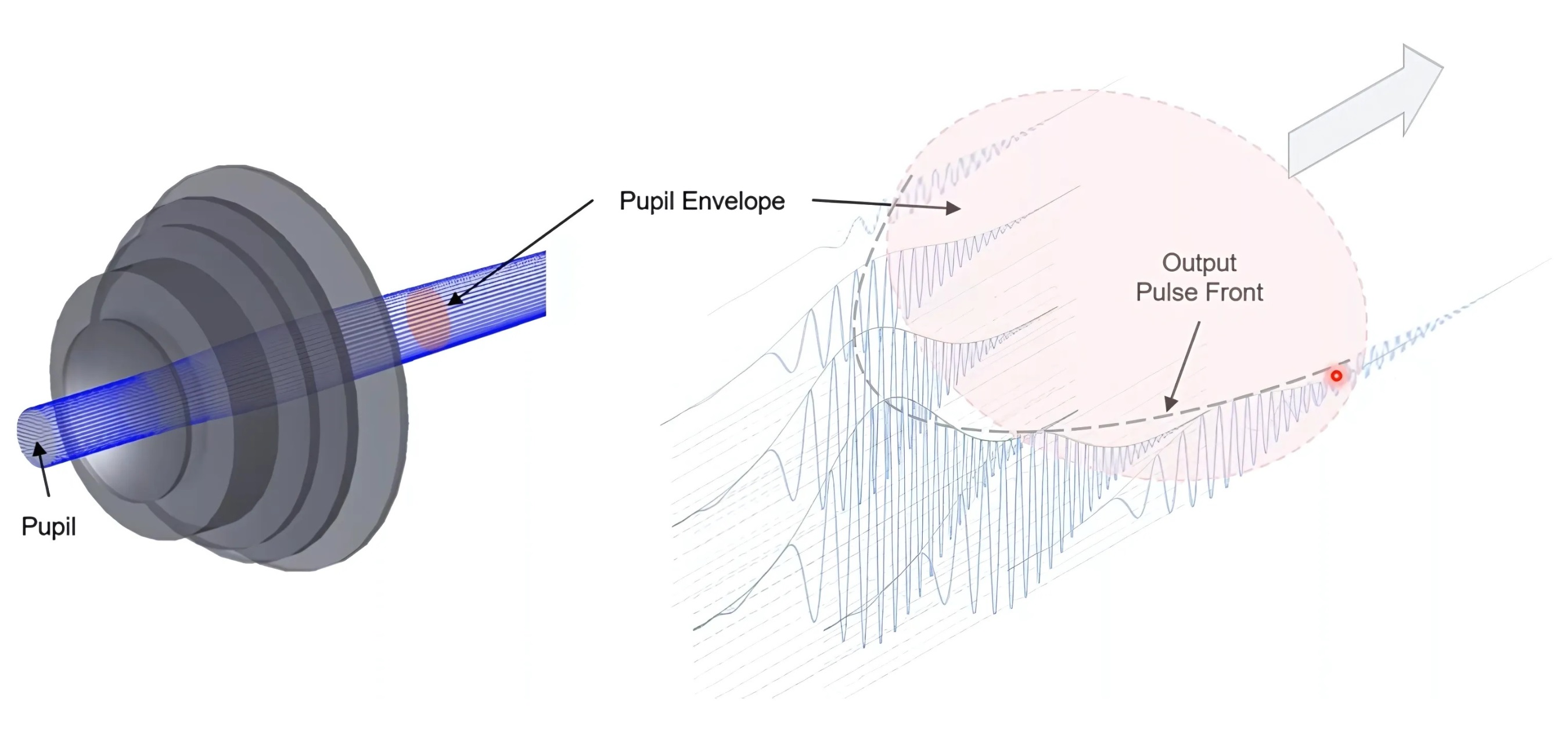 Group delay pupil distortion happens when different parts of a laser beam experience different amounts of time delay as they pass through a lens (like an f-theta lens). Imagine the laser pulse as a flat sheet moving through the lens. After passing through, the center of the beam might be delayed compared to the edges, as illustrated in Figure 8.