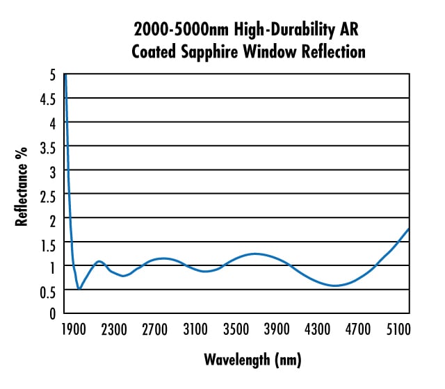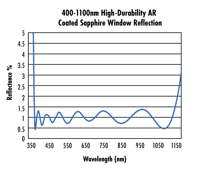 However, sometimes abrasion resistance and environmental protection are needed for visible or NIR wavelengths, or achieving high transmission becomes worth sacrificing a little bit of environmental protection. In these cases, non-DLC (but still highly durable) thin-film coatings may be the best option. Low reflectivities can be achieved while still achieving high levels of abrasion and environmental resistance. One example of a highly-durable AR coating is found on our High Durability Anti-Reflection (AR) Coated Sapphire Windows, which are ideal for harsh environments requiring thin optics.