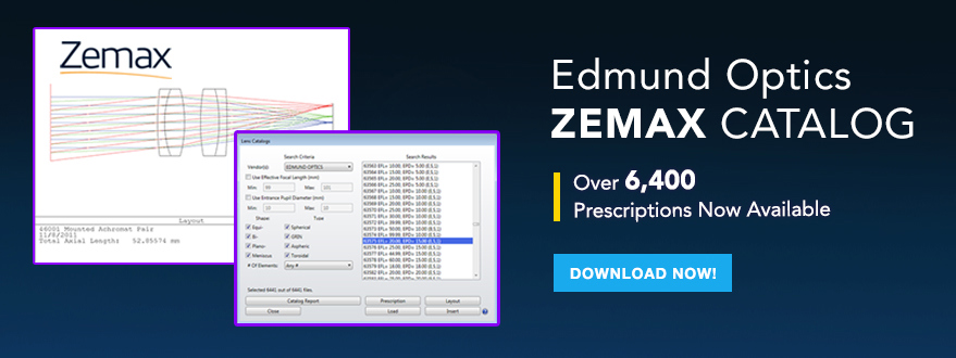 Designing a laser beam expander from off-the-shelf lenses can drastically reduce lead time and speed up the design cycle. By utilizing Zemax’s lens catalog, stock lenses can be easily selected and spacing can be adjusted for your design criteria. With Edmund Optics’ industry-leading selection of off-the-shelf lenses, either Keplerian or Galilean designs are possible. Keplerian designs will have a longer system length with an internal focus, whereas Galilean designs will be shorter and not have the internal focal point.