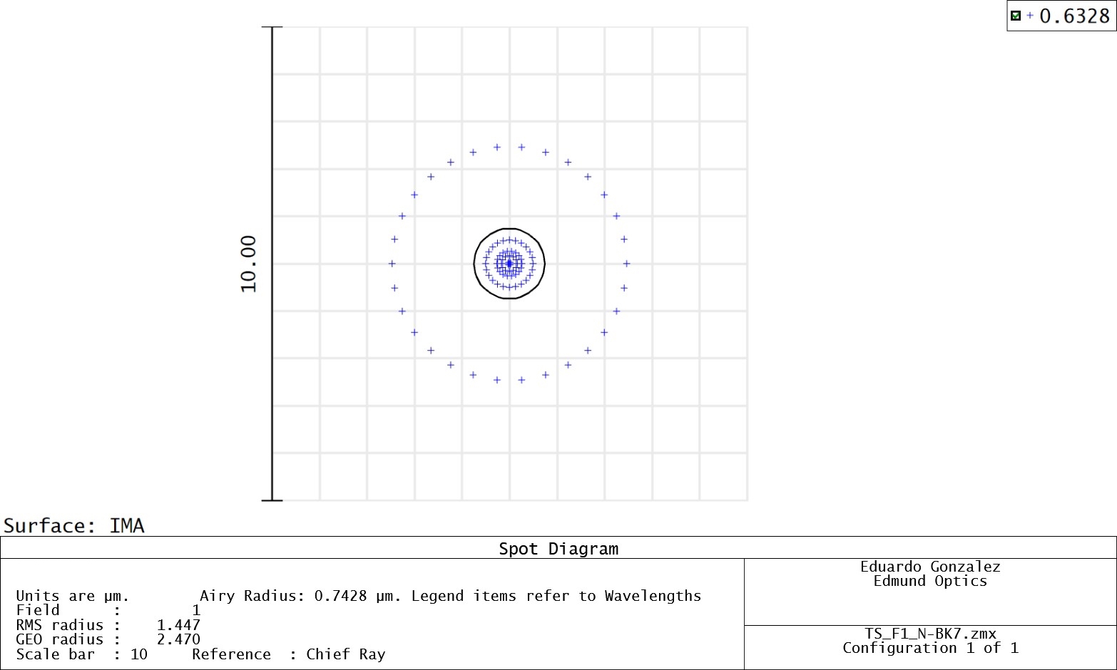While prime lenses require more time and involvement to design, their advantages over best form lenses are often well worth it. Best form lenses often struggle with spherochromatism and narrow field, as previously mentioned. Figure 4 and Figure 5 show spot size comparisons between both design approaches. Prime design allows for the mitigation of these difficulties. The orientation of prime aspheres allows for smaller spot sizes due to the refracting power being split between two surfaces instead of one. Additionally, this orientation causes prime aspheres to be less sensitive to changes in light wavelength. Finally, prime aspheres are better at handling off-axis rays and misalignment in systems. Off-axis performance is better suited to these lenses than best form designs. However, for all the advantages of prime aspheric lenses, they do have their disadvantages. When their orientation is flipped, performance will deteriorate, and total internal reflection may occur. Thankfully, this is easily avoided by being familiar with the intended design of prime aspheres and recognizing their correct orientation.