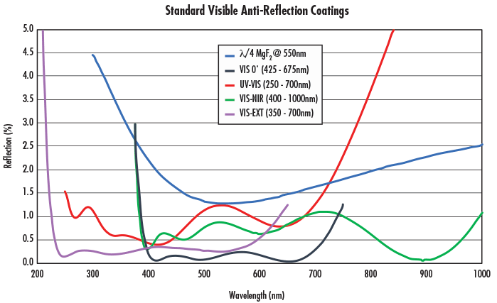 Anti-reflection (AR) coatings are often put on optical windows to maximize transmission in the desired wavelength range. Edmund Optics offers all TECHSPEC® windows with a variety of anti-reflection (AR) coating options that vastly improve the efficiency of the optic by increasing transmission, enhancing contrast, and eliminating ghost images. Most AR coatings are also very durable, with resistance to both physical and environmental damage. For these reasons, the vast majority of transmissive optics include some form of anti-reflection coating. When specifying an AR coating for your specific application, you must first be fully aware of the full spectral range of your system. While an AR coating can significantly improve the performance of an optical system, using the coating at wavelengths outside the design wavelength range could potentially decrease the performance of the system. The figure below shows the reflection plots of all the standard AR coatings we offer.